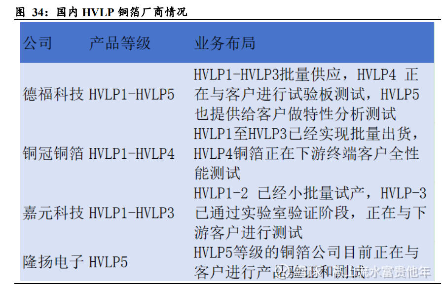龙头企业验证节奏加快,产业链导入窗口或将逐步打开。德福科技HVLP1-2产品已实现小批量供货,主要面向英伟达项目及400G/800G光模块场景,HVLP3产品通过日系CCL客户认证并用于国内算力板项目,预计2025年放量,HVLP4已进入试验板测试阶段,HVLP5正在进行客户特性分析;嘉元科技已实现HVLP1-2批量化,HVLP3通过实验室验证阶段,正与下游客户测试;隆扬电子凭借在超薄、超平坦铜箔的工艺路线优势,抢先进行HVLP5开发。