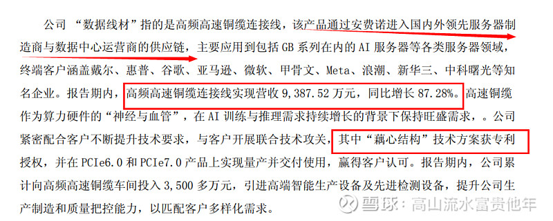 公司未来的增量业务与增量技术想象力在于藕芯铜缆毕竟背靠安费诺,在藕芯铜缆没有放量情况下公司的高频高速铜缆连接线实现营收 9,387.52 万元,同比增长 87.28%。高速铜缆 作为算力硬件的“神经与血管”,在 AI 训练与推理需求持续增长的背景下保持旺盛需求;