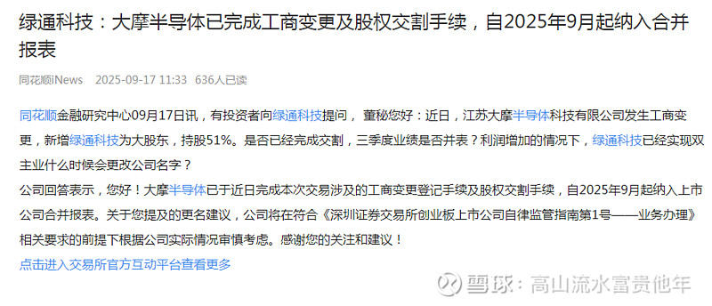 绿通科技是通过自己的超募资金直接购买只用了不到三个月已经完成工商变更,不像很多公司自己质地不咋地都要募资,要拖很久很多最后都不了了之。三季报直接并表这样业绩可以切实落到实地,考虑到AI对半导体扩产的挤出效应,大摩半导体有望在一季报增长20%的基础上业绩进一步加速,三季度半导体旺季!