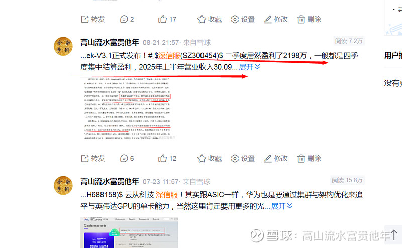 $深信服(SZ300454)$ 三季度居然盈利一个多亿同比增长10倍,其实这个半年报我就明确指出业绩拐点,利润第一次在二季度转正。一般软件类云计算主要业绩在四季度,大家去看中国软件很多公司都是这样。财报季埋伏财报这个固定盈利模式我打磨了十年每年都在进行微调,深信服这个位置性价比高值得财报前一天博弈,即便不及预期影响也不大因为是软件类在坑里就没反弹意味着没有预期,类似我一季报前一天埋伏新易盛,仕佳光子(毛衣战大坑)