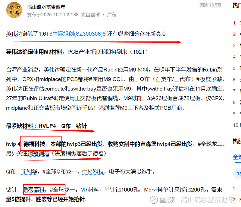 继续说下M9昨天引爆的两个点,继钻针$鼎泰高科(SZ301377)$ 激光钻大族数控之后,昨天发酵的是主要用二代布,Q布还需要时间,所以$宏和科技(SH603256)$ 连续上攻;另一个就是低轮廓铜箔的需求进一步拉升,$铜冠铜箔(SZ301217)$ 涨停创历史新高,低估的德福科技也接近新高,关于M9全产业链我们很早之前就分析的很透彻了,几乎所有点过名的最近一周多走势极其凶悍!(如下图所示)