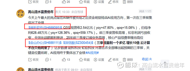 另外这次AI应用涨的东西也不是概念为主,千亿市值$金山办公(SH688111)$ 每次都是脉冲行情连外交部点名都不行,但是最近底部放量慢慢推收复了,$深信服(SZ300454)$ 大涨三季报增长10倍,不可能海外云厂商都有业绩我们没有吧,亚马逊云业务大超预期盘后涨了12%阿里云去年有了深信服二季度就业绩超预期回正了,$三六零(SH601360)$ 以前哪次涨有业绩亏得一塌糊涂今年三季报居然挣了1.5个亿多少年了
