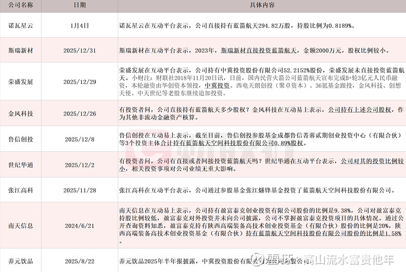 感觉$诺瓦星云(SZ301589)$公司直接持有蓝箭航天294.82万股,持股比例为0.8189%。 这个是被严重低估了啊。$荣盛发展(SZ002146)$ 也可以啊,相对于$鲁信创投(SH600783)$ N个板,金风科技历史新高这俩参股公司其实性价比很可以的,挖掘一下#商业航天板块持续上涨,雷科防务收获三连板#