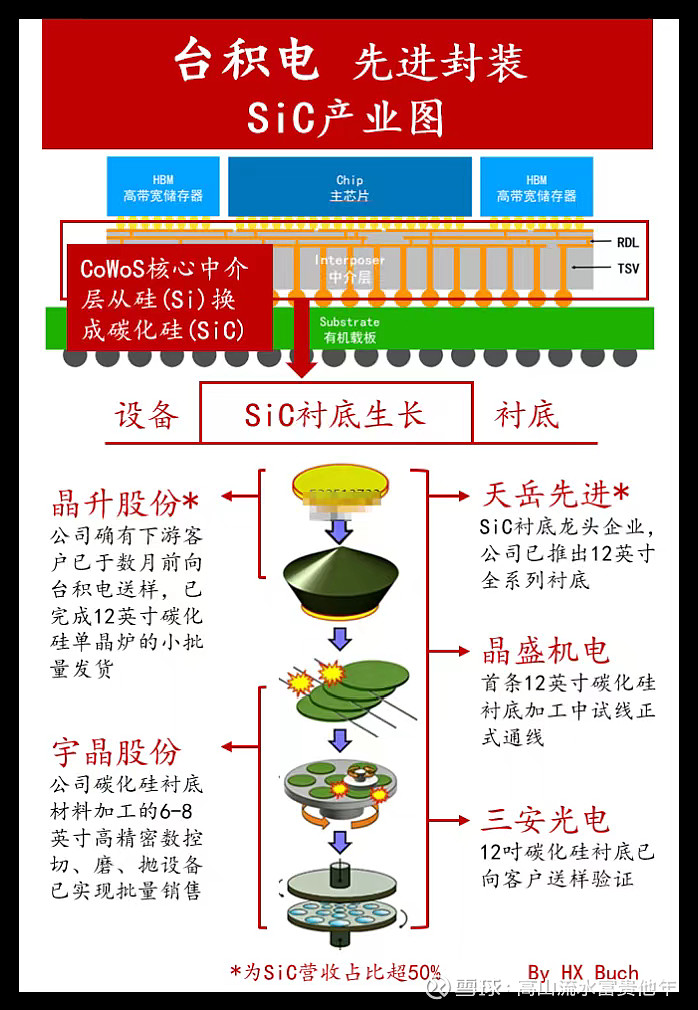 $长电科技(SH600584)$ (600584):全球封测龙头,CoWoS封装产能国内第一;已布局SiC中介层TSV通孔工艺,与台积电合作研发;2025年扩产CoWoS至月产5万片,适配12英寸SiC衬底。