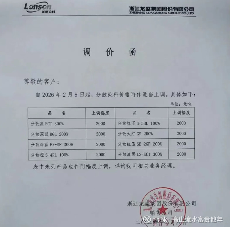 事件:浙江龙盛2月8日上调大部分分散染料的出厂报价2000元/吨。