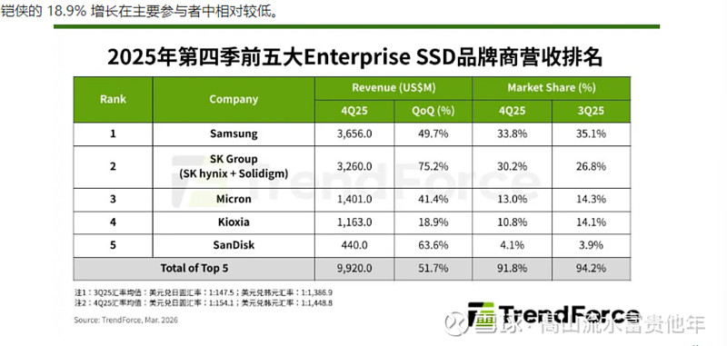 3 月 16 日消息,TrendForce 本月 13 日表示,企业级固态硬盘 (eSSD) 业务在 2025Q4 为五大原厂制造商(三星电子、SK 集团、美光、铠侠、闪迪)贡献 99.2 亿美元收入(IT之家注:现汇率约合 685.48 亿元人民币),环比大增 51.7%。