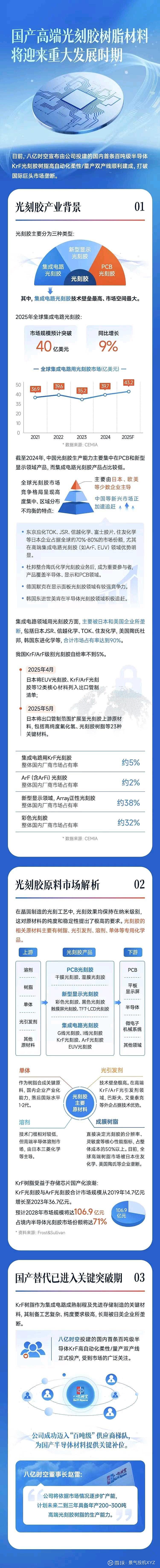2025年公司突破技术研发的KrF光刻胶树脂在分子量分散度(PDI)和金属杂质纯度(ppt级)上达到国际水平,打破日美垄断。2025年产能规划100吨(自由基树脂60吨+阴离子树脂40吨),于光刻胶成本占比50%,下半年已实现千万元级收入,预计年化收入1-2亿元;2026年扩产至200-300吨,收入规模超3亿元。自由基树脂:单价约100-150万元/吨,主要供应厦门恒坤,应用于存储芯片制造(如长江存储的验证中占比达50%)。厦门恒坤(688727)通过持有八亿时空子公司上海八亿时空先进材料有限公司11.11%的股权,形成资本层面的深度绑定。