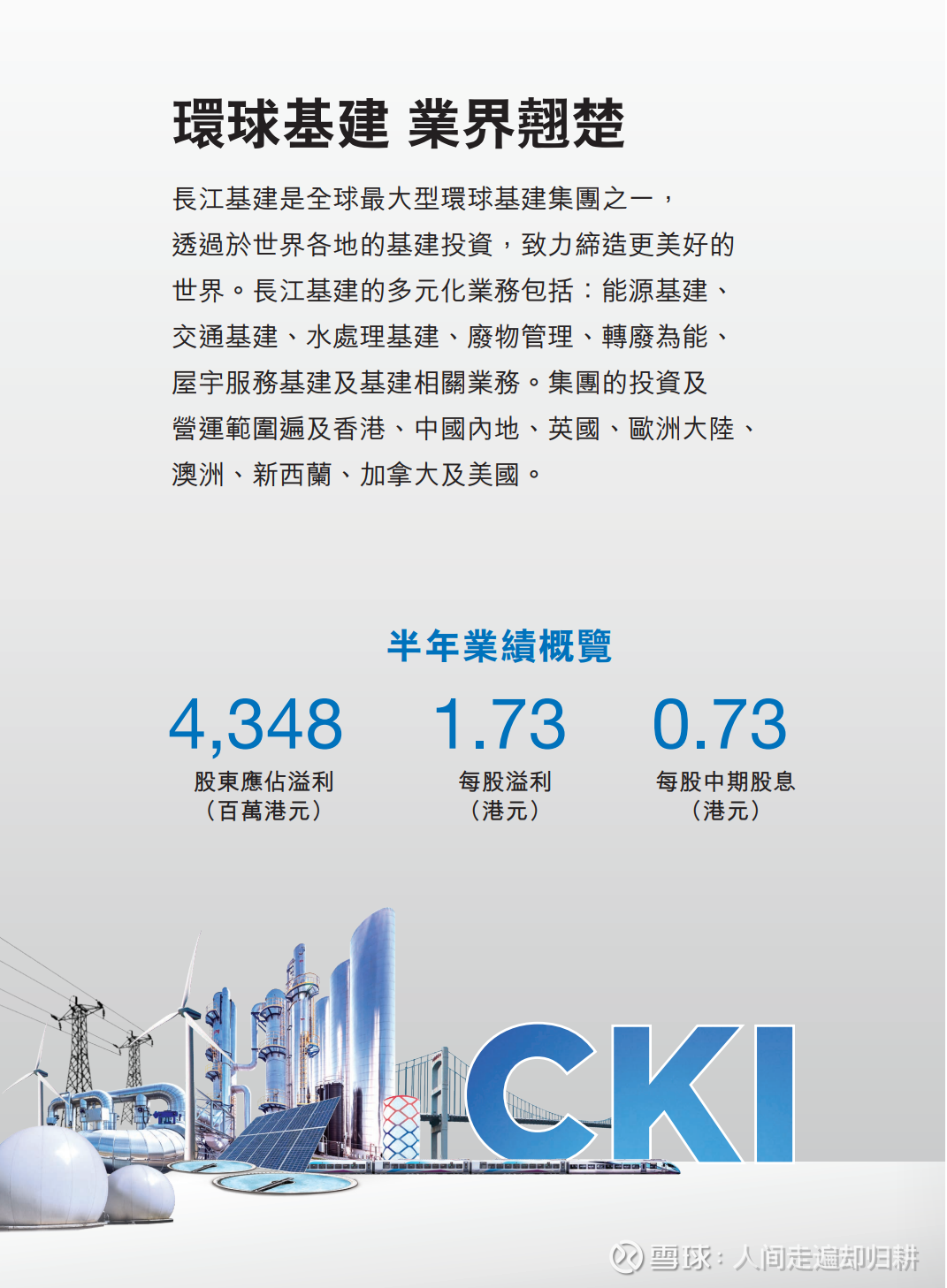 简析:长江基建集团的年报可读性是比较强的,简洁,清晰,内容详实,专注于基建业务,股息小幅稳步增长,是李嘉诚家族稳定经营最为典型的基石企业。