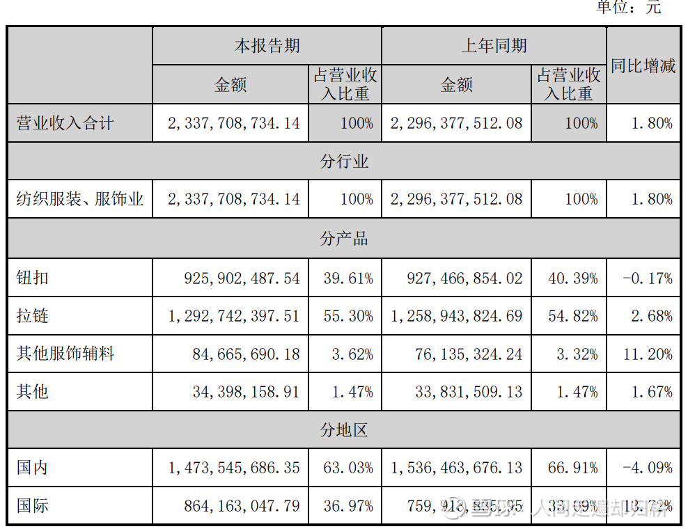 纽扣营收减少-0.17%,拉链营收增长2.68%,其他服饰辅料增长11.20%,但占营收比重只有3.62%。