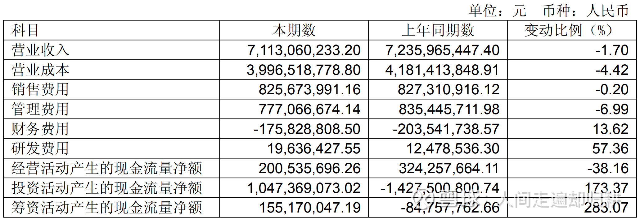 营业收入71.1亿元,同比-1.7%;利润总额16.16亿元,同比0.71%;归属于上市公司股东的净利润15.86亿元,同比29.57%;归属于上市公司股东的扣除非经常性损益的净利润15.13亿元,同比25.17%,经营活动产生的现金流量2亿元,同比-38.16%。