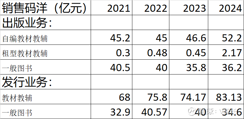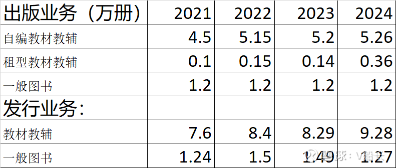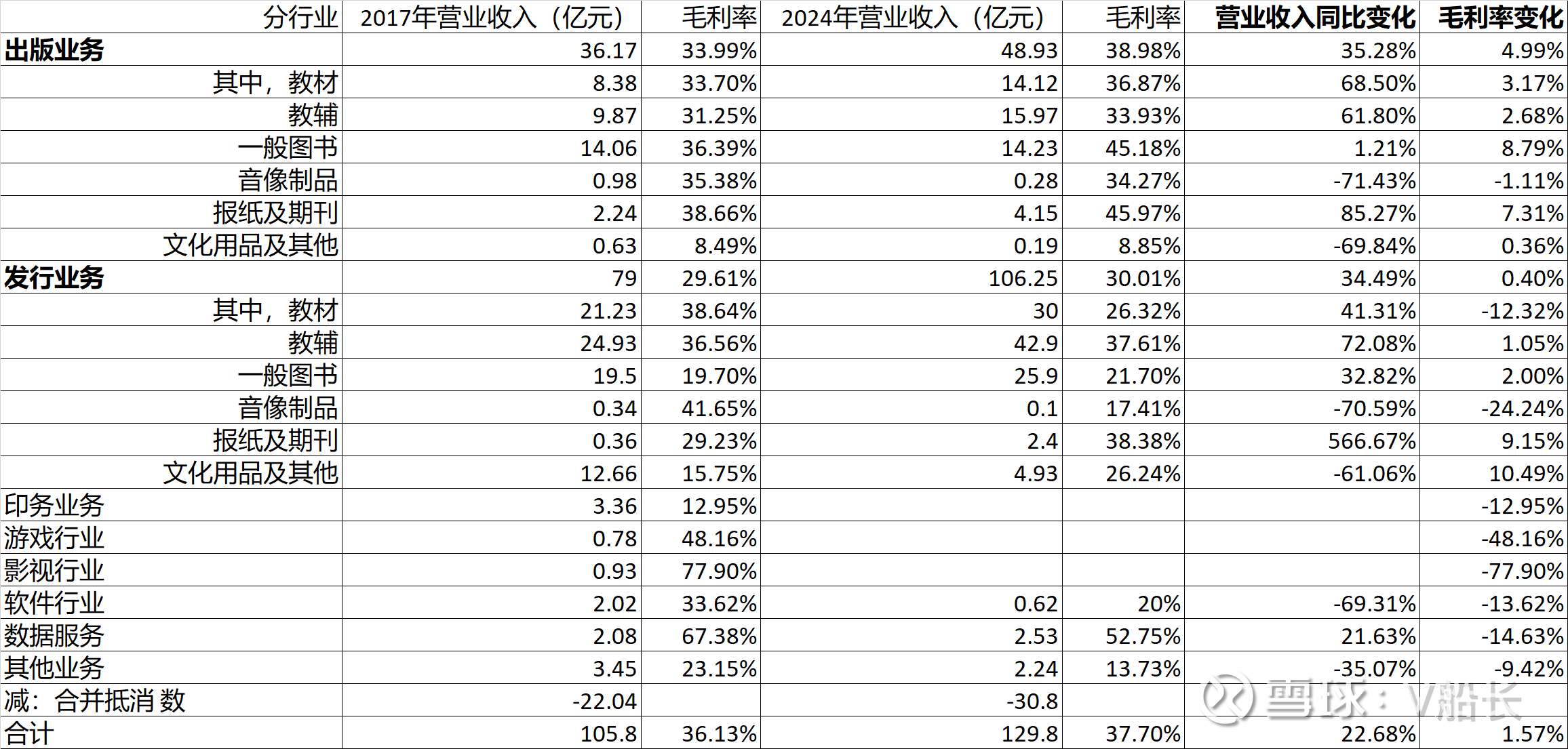 总结:从这些数据看,凤凰传媒相比2017年,业务更聚焦,经营水平和质量还是有很大的提升。逐年的比较往往不容易看到缓慢变化,拉长时间,一切变得清晰起来了。出版和发行业务教材教辅业务:2017年64.4亿,2021年84亿,2024年103亿,教材教辅确实是凤凰传媒增长动力之源。