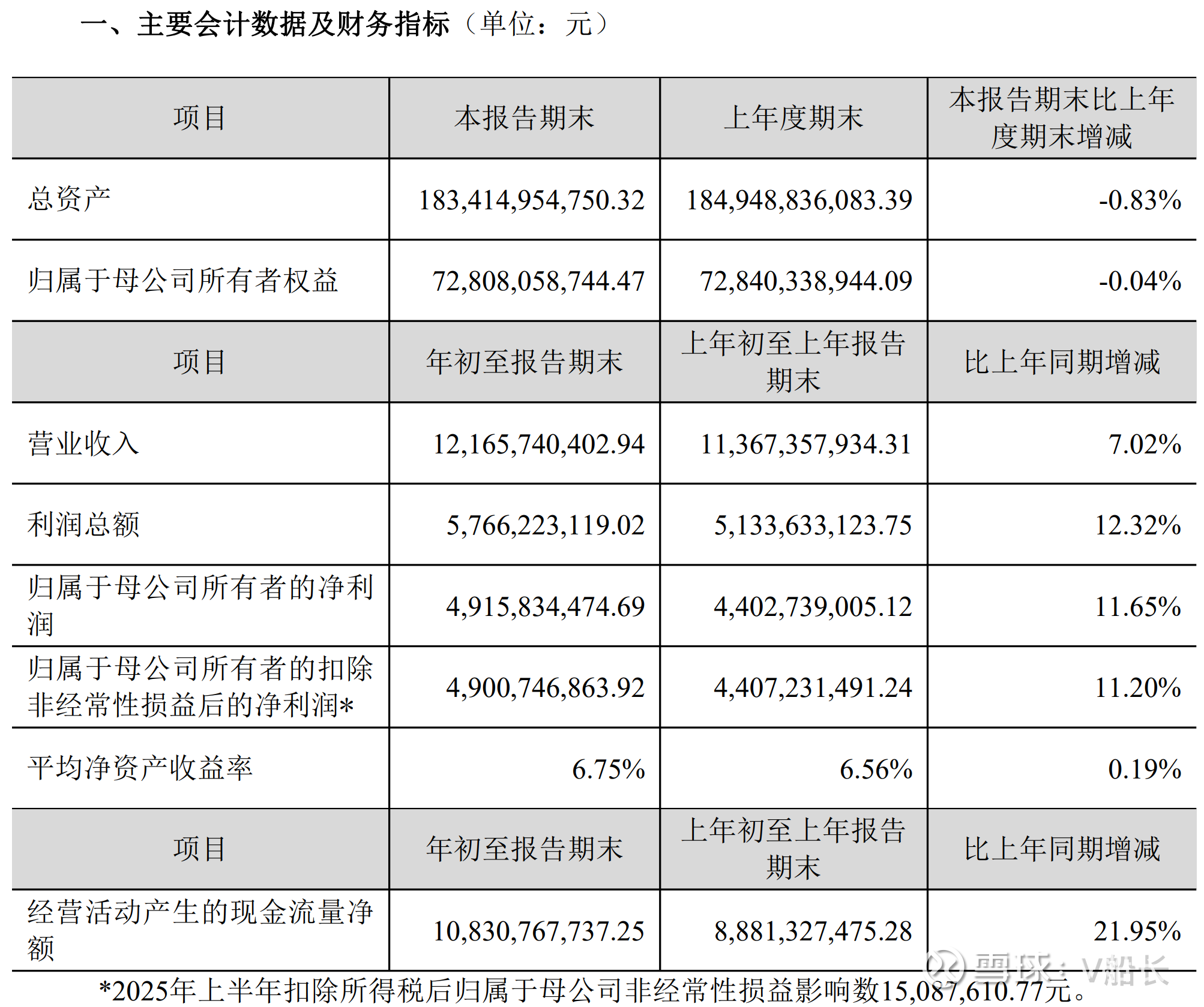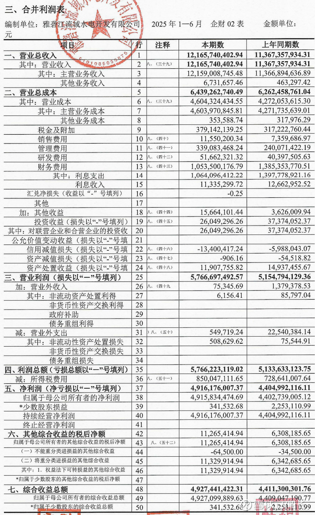 上半年财务费用10.5亿,去年同期13.85亿,减少3.35亿;利润总额57.66亿元,去年同期51.34亿,同比增加12.3%;所得税费用8.5亿,去年同期7.29亿元,同比增加16.4%;归属于少数股东的综合收益总额34万,微乎其微,可以忽略不计,说明少数股东权益占比很低。
