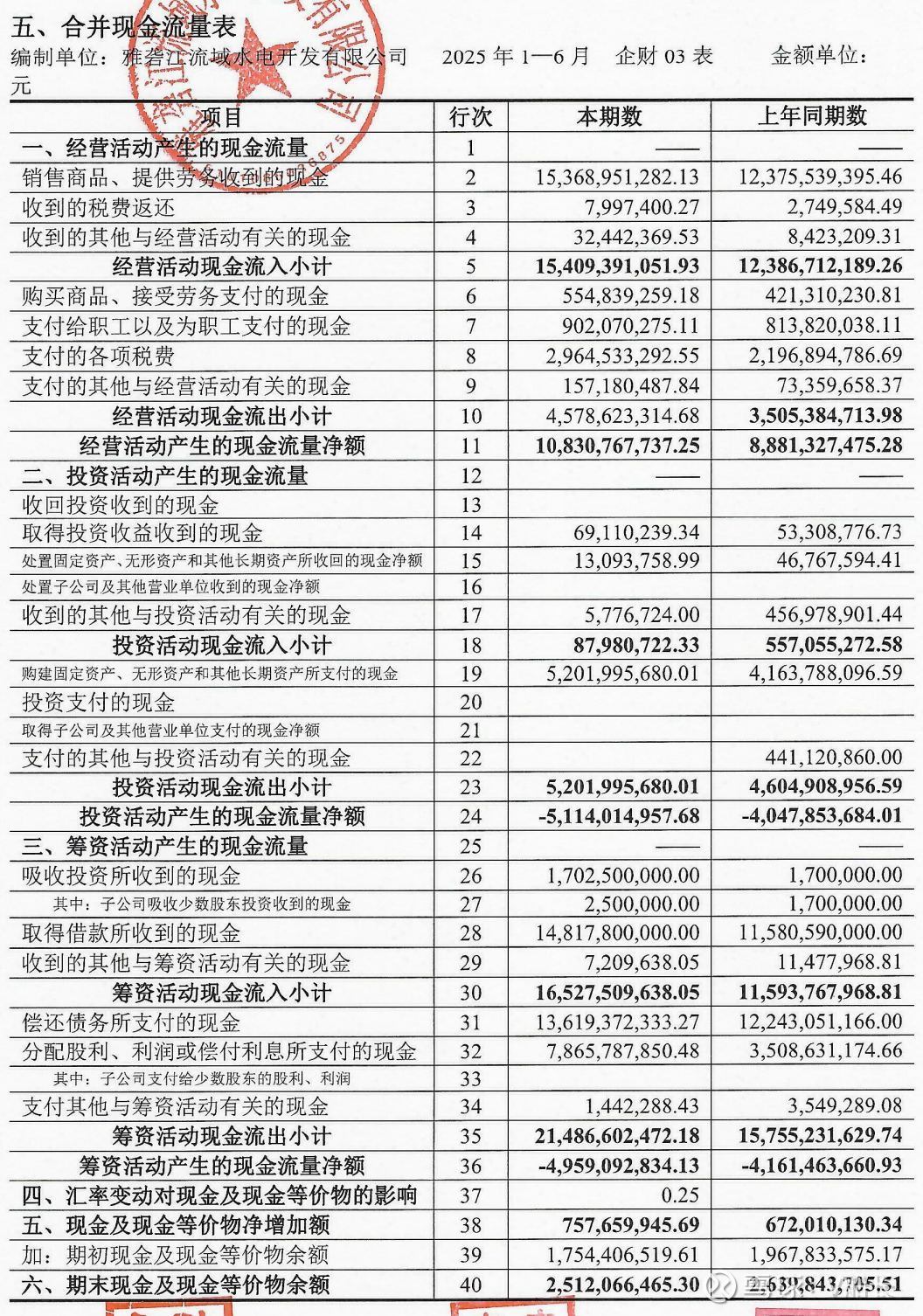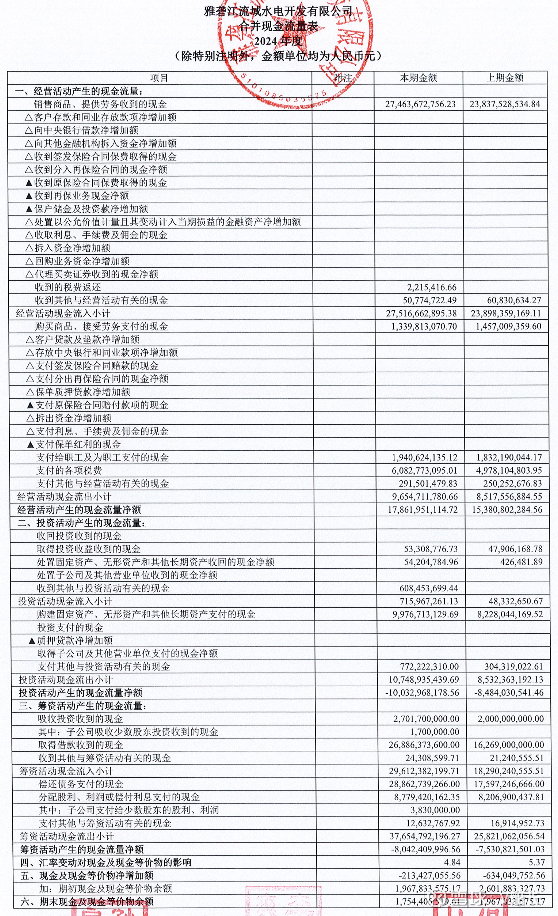 增加雅砻江2024年合并现金流量表