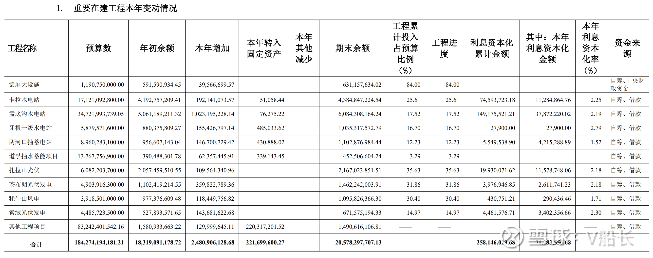 增加雅砻江在建工程详细信息,预算数1842.7亿,投资额巨大。重要水电站投资项目,比如卡拉水电站,孟底沟水电站,牙根一级水电站,两河口抽搐电站,道孚抽水储能项目工程进度都在30%以下,扎拉山光伏,茶布朗光伏发电,牦牛山风电和索绒光伏发电工程进度都低于40%,只有锦屏大设施投资预算数11.9亿,84%的进度接近完成。其他工程项目还有832.4亿元预算数,应该还没有开工。