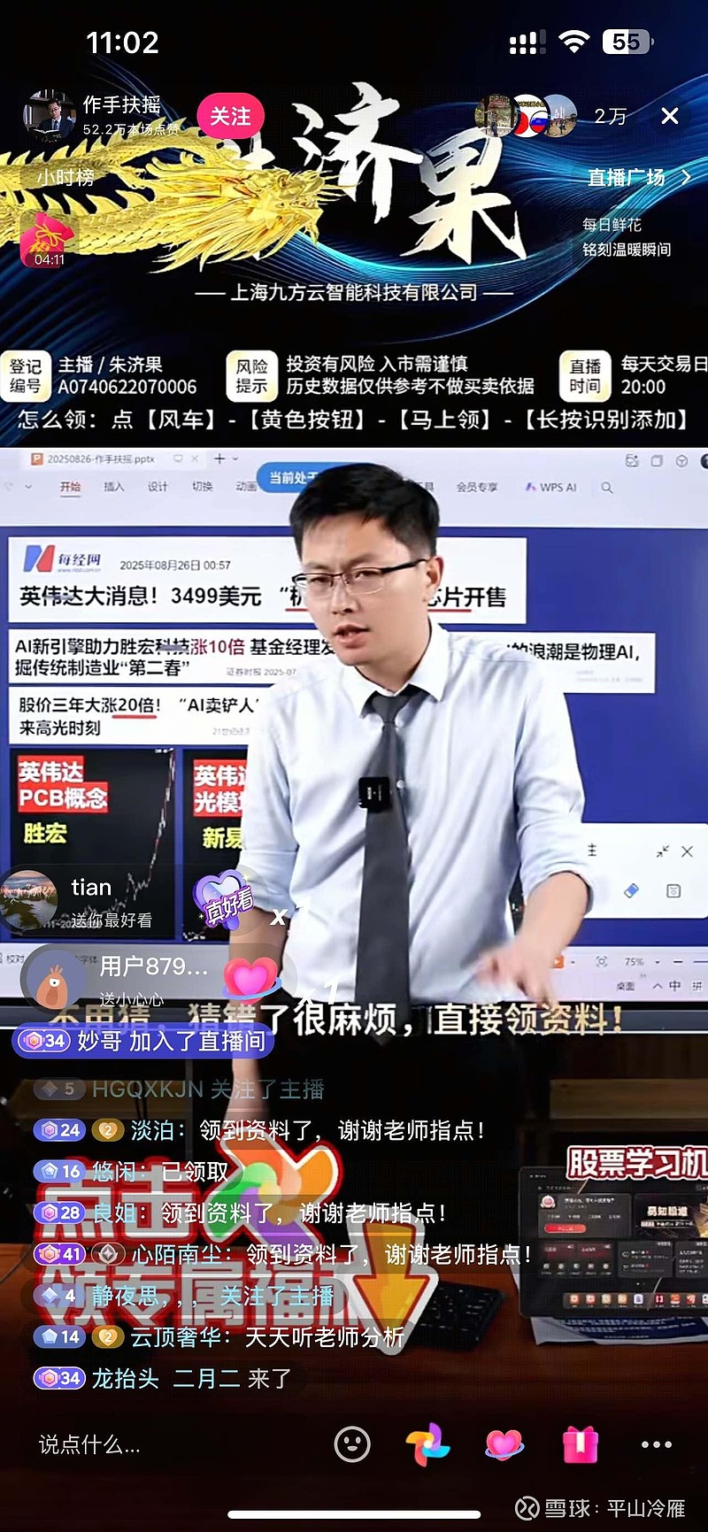 $九方智投控股(09636)$ 九方下面的直播间依然非常火热,这些投顾太会吹了。先给你复盘英伟达概念股的几个代表,都是几十倍涨幅。然后告诉你英伟达要做机器人大脑芯片了,他找到了一个纯正的英伟达供应商,今天4000多只股票下跌,它逆势上涨,底部第一个根大阳线。流通盘只有20亿,特别容易被柚子炒作。订单量是市值的3倍。然后让你领资料。没办法,小散们就好这口,九方赚得盆满钵满。