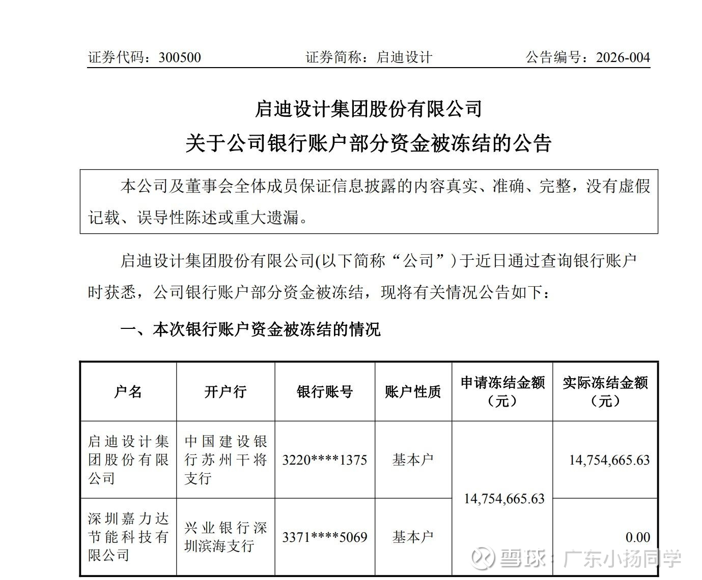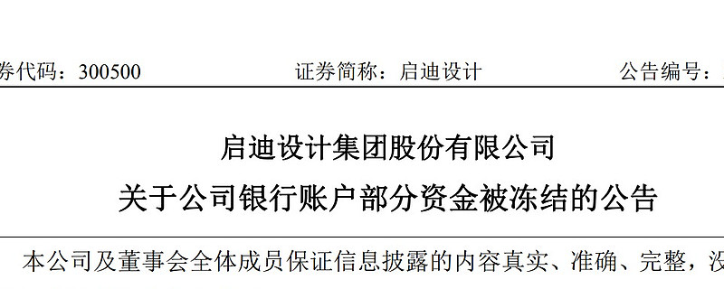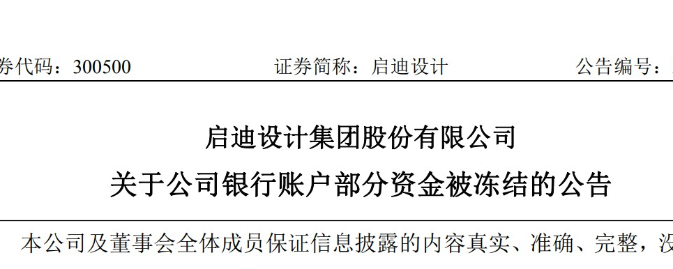 2026年2月13日,启迪设计披露《关于公司银行账户部分资金被冻结的公告》,通过查询银行账户时获悉,公司银行账户部分资金被冻结。公司表示,公司生产经营活动正常开展,未因本次银行账户资金冻结事项受到重大不利影响。
