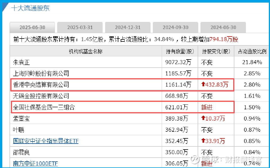 但最引人注目的还是股东名单的变化:全国社保基金四一三组合新进前十大流通股东,持股621万股(占流通股1.5%),同时香港中央结算有限公司(北向资金)大幅增持59%。国家队和外资同步看好,信号不容小觑。