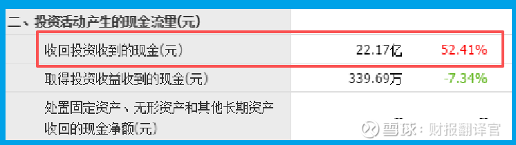 报告期内,公司收回投资收到的现金高达22.17亿元,同比大幅增长52.41%。