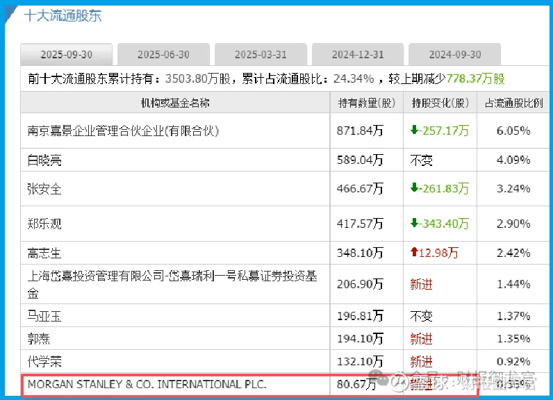 然而,就在这份惨淡成绩单披露的同时,一个极具分量的名字出现在其股东名单中——华尔街顶级投行-摩根士丹利在三季度新晋成为前十大流通股东。