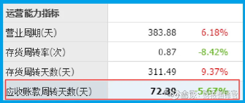现金流的暴增,引出了更多关于公司经营质量的线索。数据显示,公司的销售回款周期同比加快了5.67%,目前为72.39天。