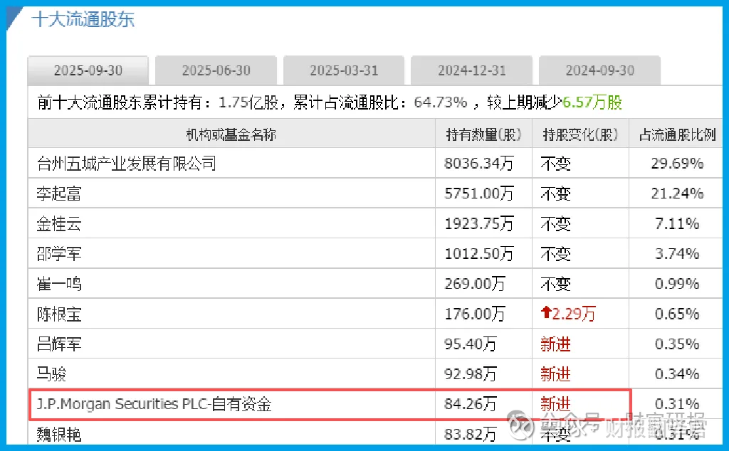 侦察从最直接的异常点开始。在最新的股东名单中,J.P. Morgan Securities PLC 以其自有资金账户,成为了第九大流通股东。