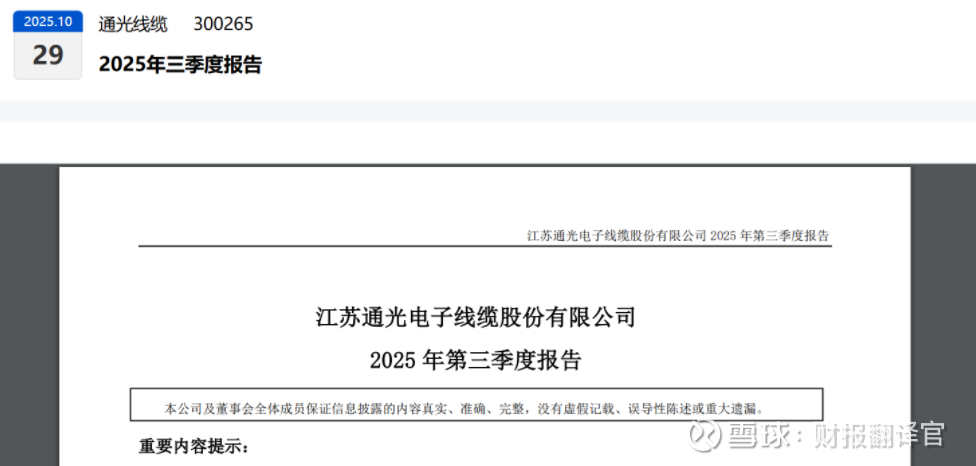 各位财侦社的学员,我是财官。今天解剖台上的目标是:通光线缆。初步观察报告令人困惑。首要指标显示:前三季度业绩为3213.34万元,同比下滑38.19%。脉搏虚弱,近乎“营养不良”。$通光线缆(SZ300265)$