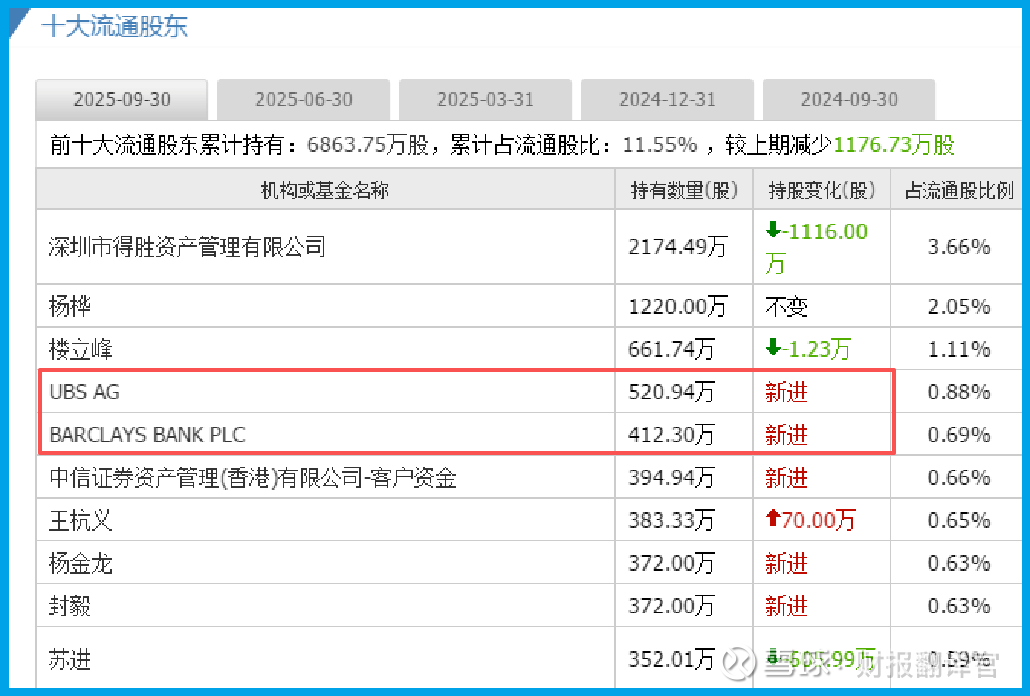 然而,更令人在意的,是这份成绩单背后的“观众席”。瑞银和巴克莱这两大国际顶尖投行,同时跻身公司前十大流通股东之列。