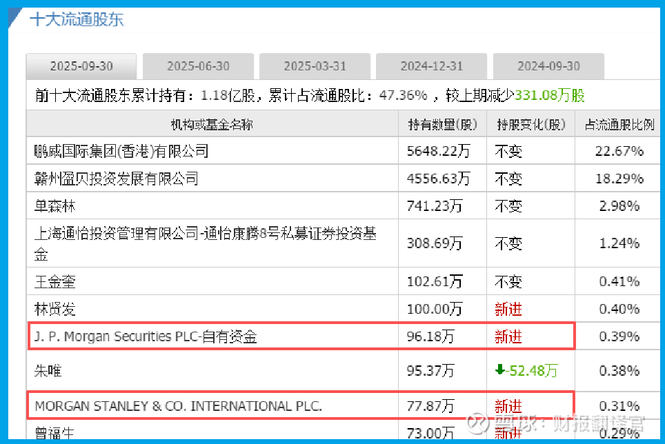 侦查从最不寻常处开始。在三季报的流通股东名单里,出现了两个如雷贯耳的名字:J. P. Morgan Securities PLC和MORGAN STANLEY & CO. INTERNATIONAL PLC.。