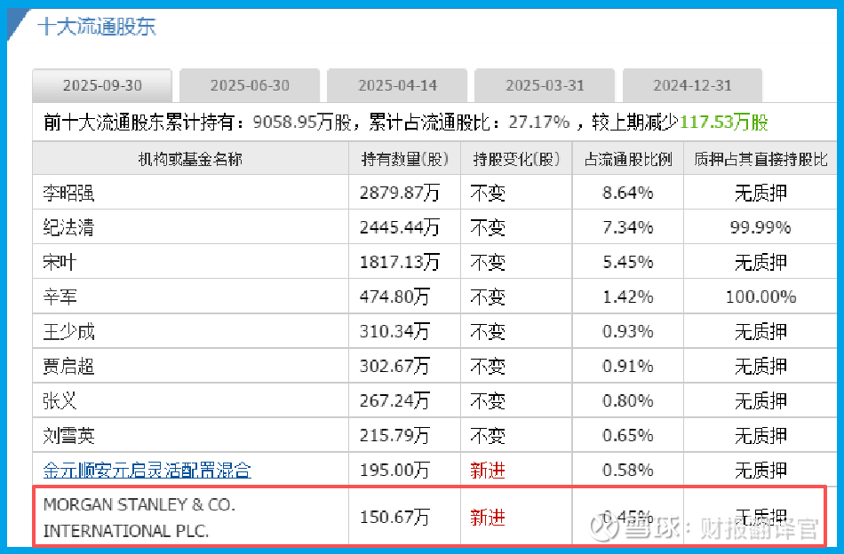 然而,股东名单上的一个名字,让这份财报充满了戏剧性的矛盾——MORGAN STANLEY & CO. INTERNATIONAL PLC.(摩根士丹利)赫然在列,成为公司新晋前十大流通股东。这家以研究和严谨著称的国际大行,难道会看走眼?