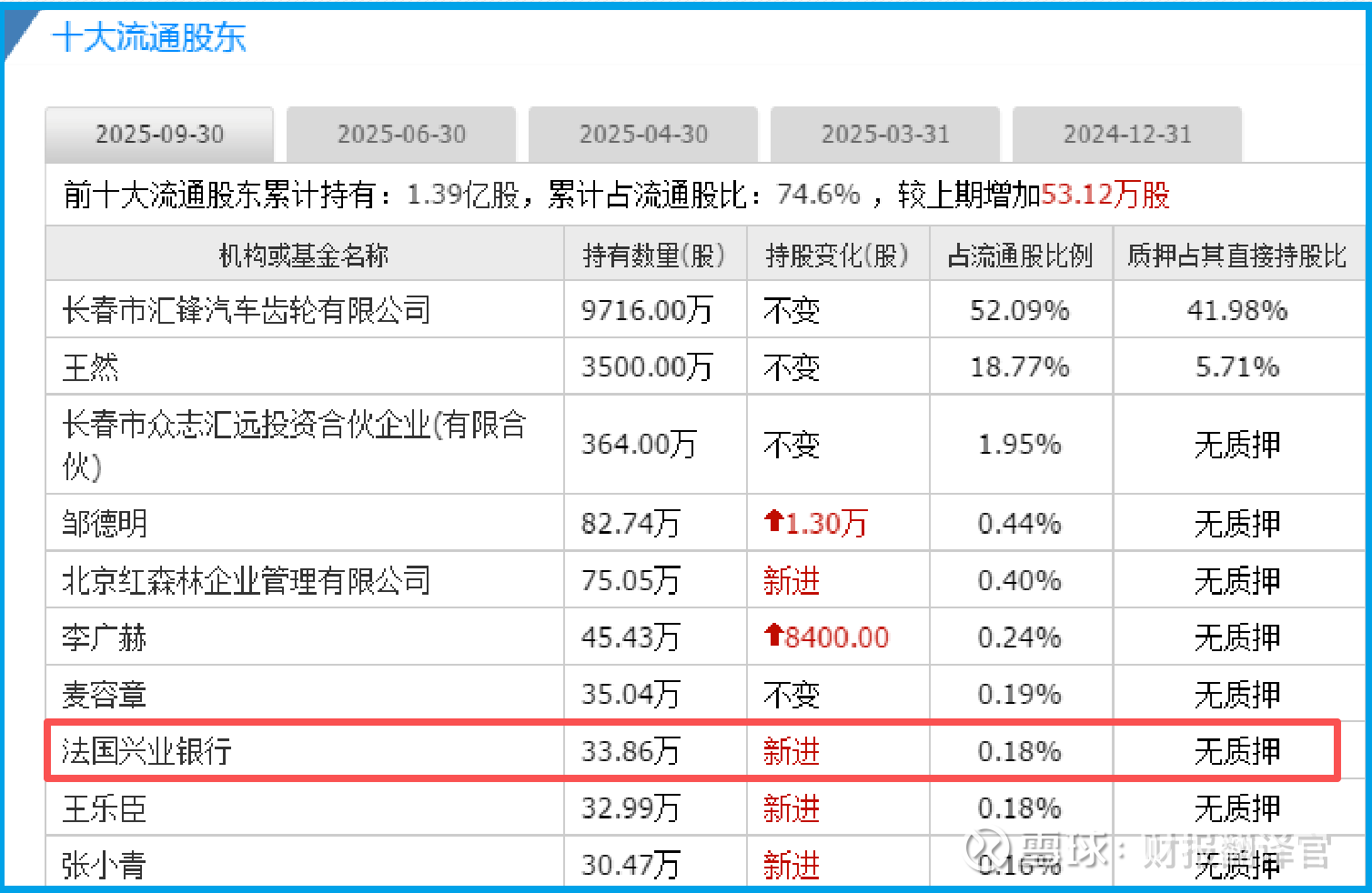 就在我们梳理财务线索时,一份“证人名单”吸引了目光:法国兴业银行出现在前十大流通股东之列。