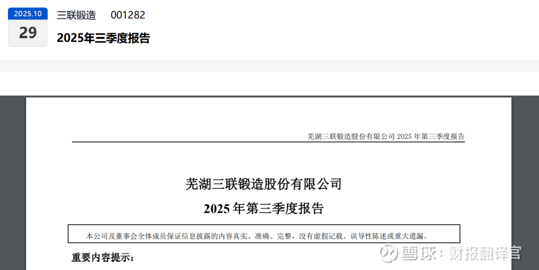 财官的案头,一份新到的三季报散发着不寻常的气息。主角三联锻造,主营汽车零部件,2025年前三季度净利润为 9147.74万元,同比下降了11.21%。业绩下滑,这在当前市场是刺眼的标签。$三联锻造(SZ001282)$