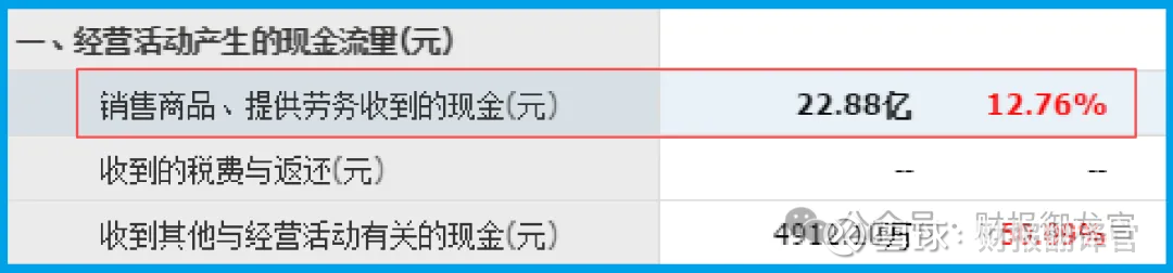 财官将视线移向现金流量表。销售商品收到的现金总额达到22.88亿元,不仅同比增长了13%,还大幅高于营业收入。