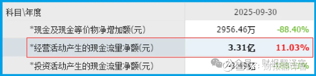公司三季度销售商品、提供劳务收到的现金”净额达到3.31亿元,同比增长11.03%,且高于净利润。
