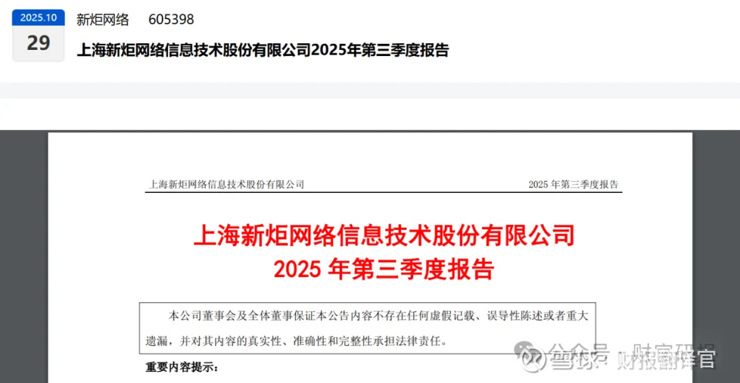 今天送上案头的,是新炬网络的2025年三季报。翻开第一页,触目惊心。$新炬网络(SH605398)$