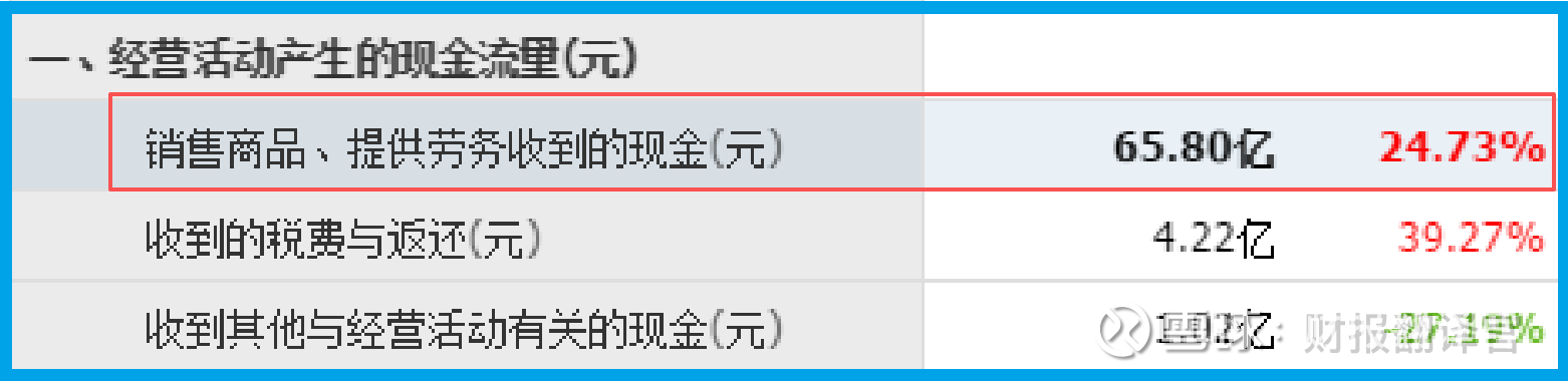别急,咱们把第二个证人请上来:销售商品收到的现金,65.80亿。这数字啥概念?比公司的营业收入还高。而且涨了24.73%。
