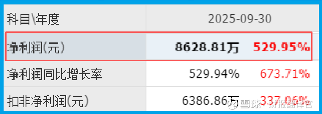 咱们先提审第一个证人:净利润。2025年三季度,净利润8628.81万。比去年同期涨了529.95%。