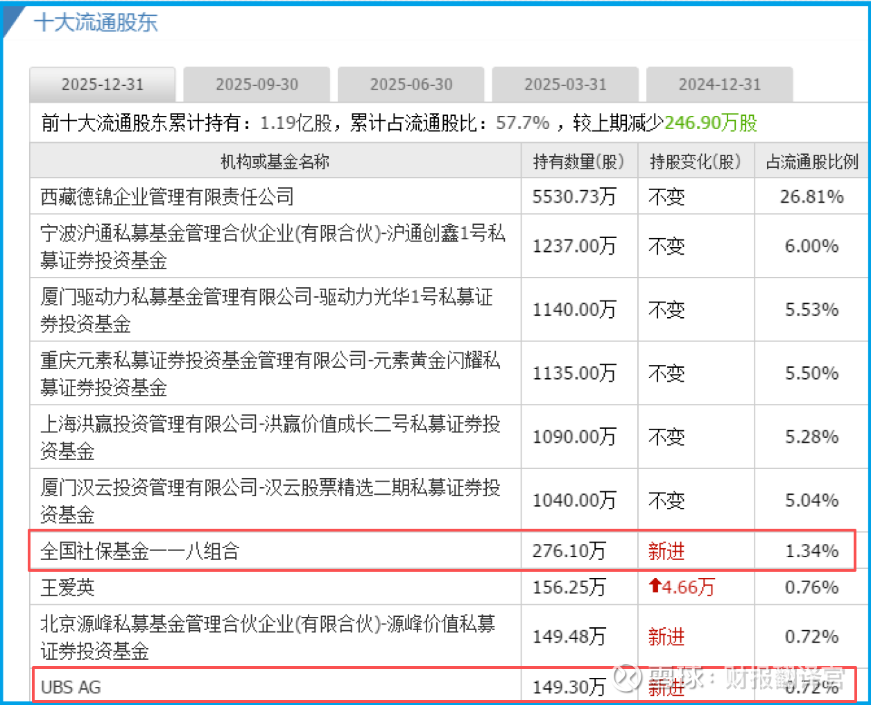 再翻翻前十大流通股东,两个熟悉的名字赫然在列——全国社保基金一一八组合和瑞银UBS AG。
