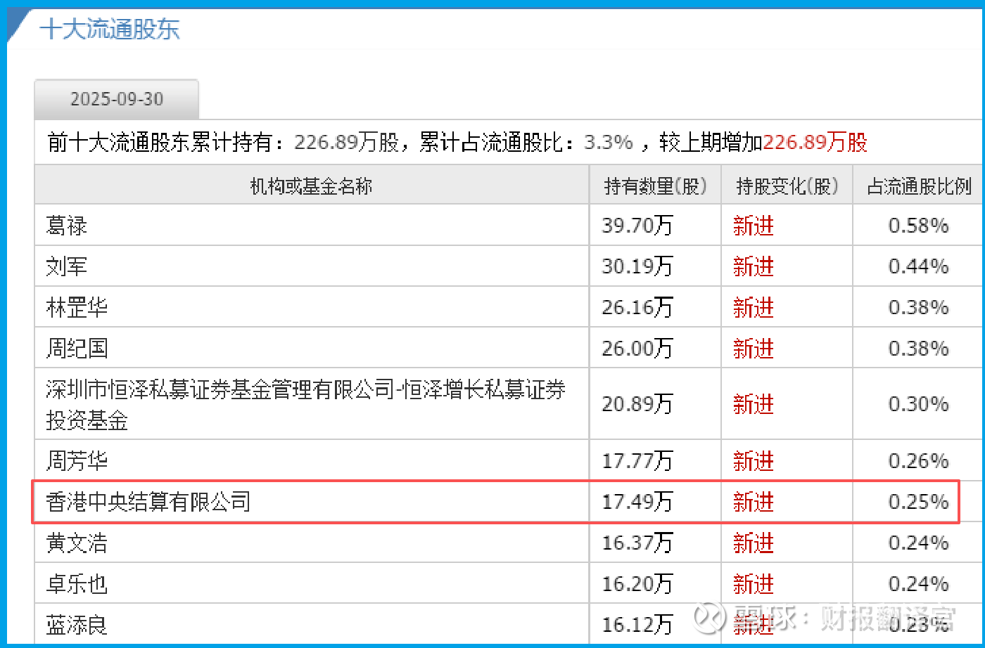 北向资金香港中央结算有限公司,新进前十大流通股东。