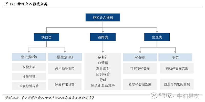 脑血管病包含药物治疗、介入治疗和主流治疗。神经介入治疗是微创医疗技术。在数字减影血管造影(DSA)系统支持下,采用血管内导管操作技术,通过选择性造影、栓塞、扩张成形、机械清除,药物递送等方法,对病变进行诊断和治疗。神经医疗机械介入器械包括三类:(1)缺血类:通过取栓或扩血管治疗脑血栓、脑栓塞、血管狭窄引起的缺血性脑卒中(2)通路类:在神经介入收入中建立通路,传送器械、封堵压迫等;(3)出血类:治疗颅内动脉瘤,封堵畸形血管以及封堵颅内血管破裂处。