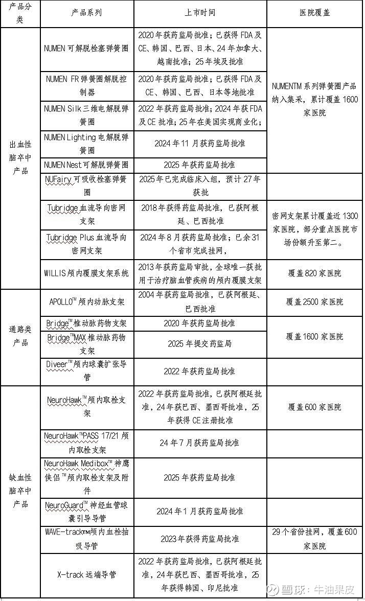 微创脑科学的产品主要包括三个方面:出血性脑卒中产品、通路类产品、缺血性脑卒中产品。截止25年6月底共有27款产品获批并实现商业化,8款产品实现海外销售,主要产品情况如下:
