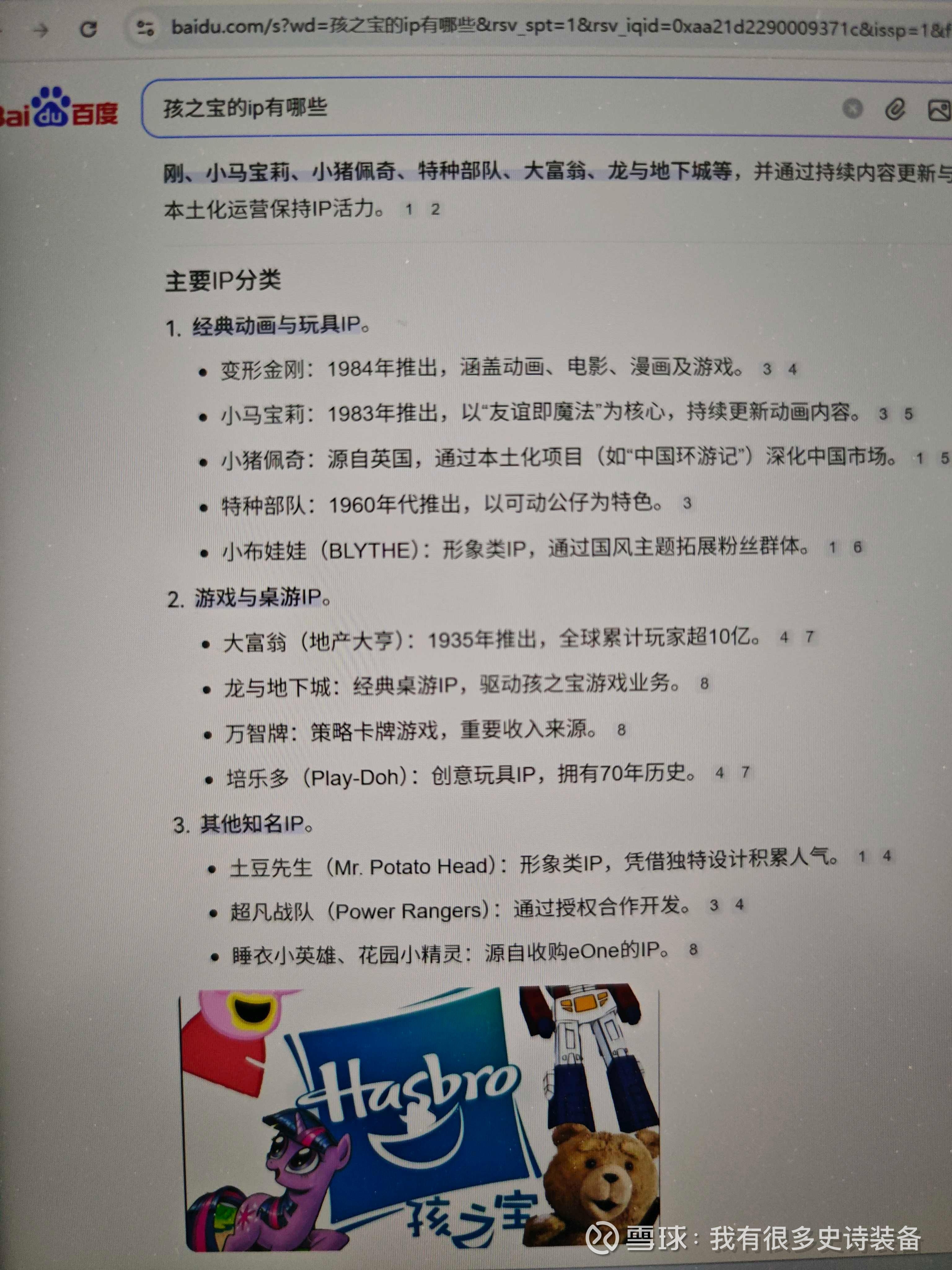 回复@我有很多史诗装备: 美泰就靠一个芭比就够了,迪士尼就靠公主和米老鼠,这些都是经典IP,孩之宝有很多IP,之前没人做军人公仔,孩之宝做了就爆发,现在泡泡玛特做小个的盲盒PVC公仔爆火,目前看,拥有经典IP的传统巨头玩具商并没有去做盲盒PVC公仔的,如果也做會如何?//@我有很多史诗装备:回复@真切的致富小寿司店:孩之宝的Ip都很传统,没啥大的生命力,属于饿不死也富不起来的那种。税后利润一年才两三亿美金。毛利率70,净利率不知道为啥就只有不到5了,很离谱。
