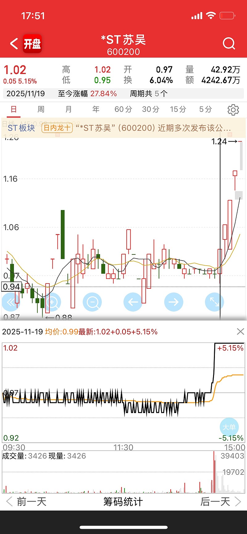 然后第二天19号我就开始看这个st板块,然后那天下午尾盘这个st苏吴和st东通刚好刚好刚好首板涨停,刚好因为我有了这么个念头我想着去看st板块,就这么被我看见了。以前都不怎么看这些股票,基本不看。