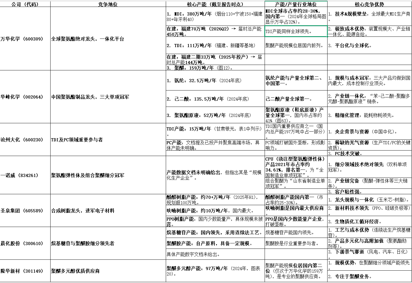 第一梯队(全球龙头):万华化学,在MDI、TDI、聚醚等核心原料上拥有绝对规模和成本优势。