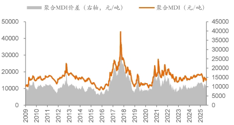 2025年(尤其是Q3至今)结构性反弹期:供给端发生重大扰动(科思创德国TDI不可抗力30万吨、日本三井减产等),叠加行业库存降至低位、“反内卷”政策预期,TDI价格率先大幅反弹,MDI价格企稳回升。这标志着周期可能正从底部区域走出,进入一个由供给优化驱动的修复阶段。