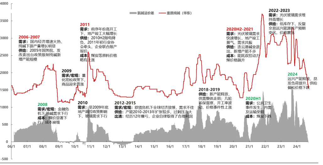 当前周期(2023年底至今):受地产需求下滑、光伏玻璃增速放缓、而天然碱等新产能大量释放影响,行业进入供过于求的下行周期,价格从高位持续下跌至成本线附近。