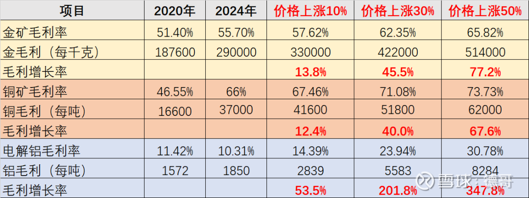 下图我以2024年的数据为基础,测算了产品涨价10%、30%和50%的情况,金和铜的毛利增长比产品价格增长比例略高,而电解铝的毛利增长比例能高几倍。这就是低毛利带来的弹性。