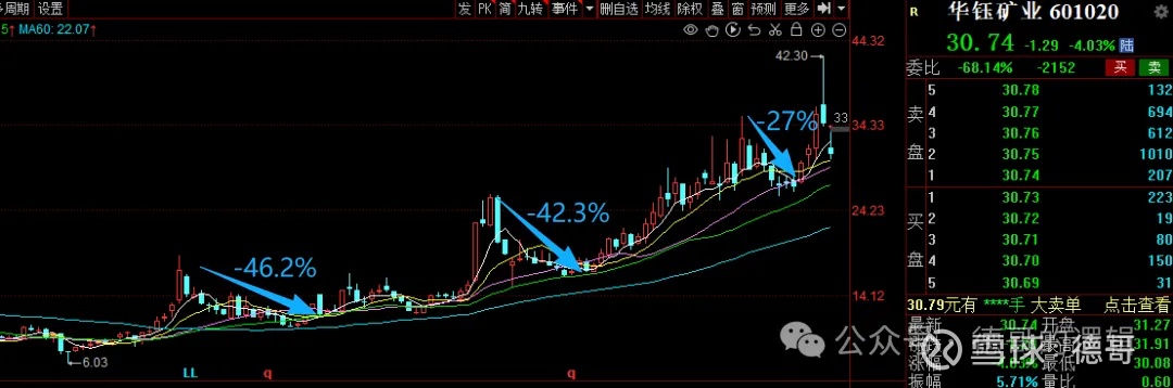 华钰矿业:24年2月到5月,6.03上涨到18.79,上涨超过3倍,到24年9月回调至10.07,回调幅度46.2%;