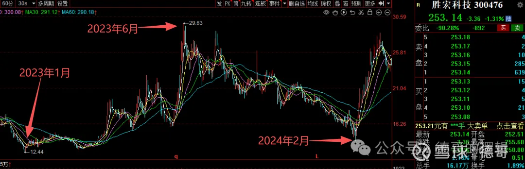先看看在25倍主升浪之前的走势,23年1-6月,胜宏从12.44涨到29.63,在半年时间涨了2.3倍,但郁闷的是其后半年又跌回24年2月的13.86,相当于跌回了原点,半年跌幅53.5%;