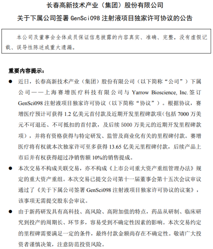 2025年12月15日晚间,长春高新发布公告,下属公司上海赛增医疗科技有限公司(以下简称“赛增医疗”)与Yarrow Bioscience,Inc.签订GenSci098注射液项目独家许可协议。