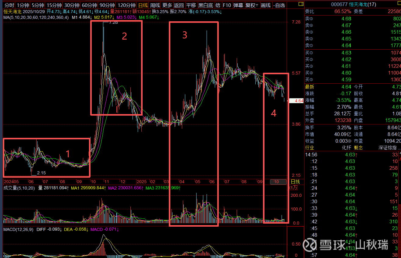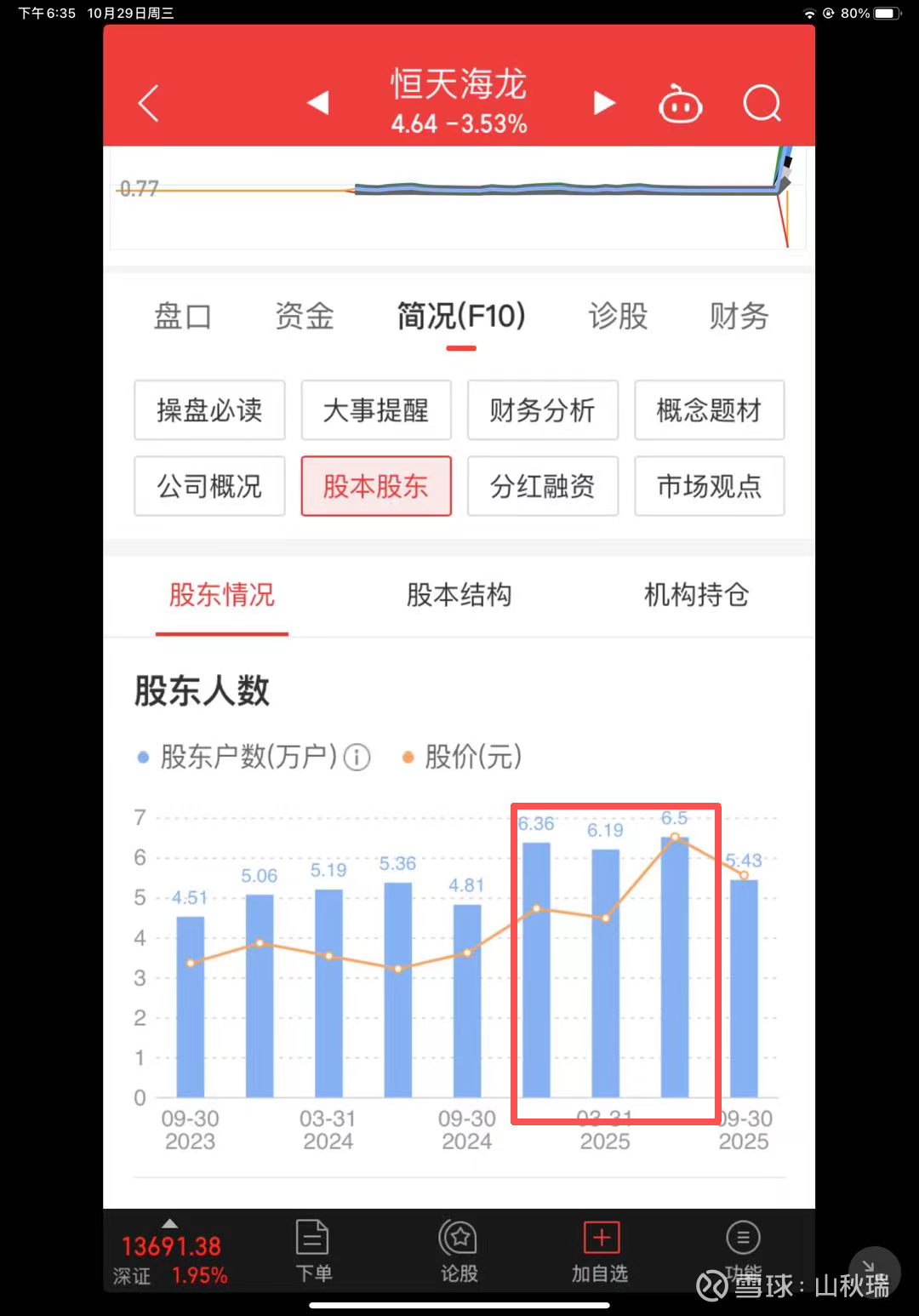 但是,在3的区域主力仍然没有出掉手上的筹码,且股东的户数又在减少。所以,我判断后面恒天海龙还会有行情的。